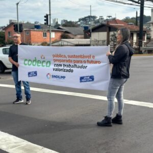 Na manhã deste sábado, 02 de agosto, o Sindilimp Caxias do Sul deu continuidade à campanha “CODECA pública, sustentável e preparada para o futuro, com trabalhador valorizado” com mais uma importante ação de rua, desta vez realizada em um dos pontos de maior circulação da cidade: a esquina da Rua Moreira César com a Perimetral Ruben Bento Alves.