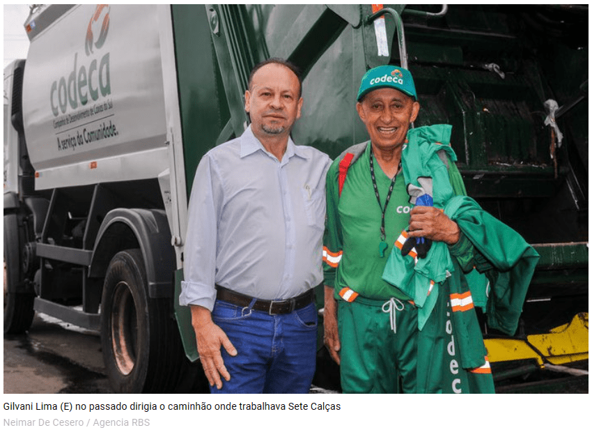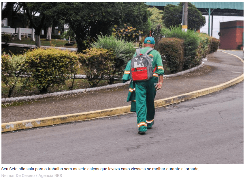 O costume para, segundo ele, prevenir resfriado e sempre trabalhar “enxuto” o alçaram ao patamar de personagem da Codeca, um dos tantos que lá trabalham. Natural de Bom Jesus, o bem humorado Sete Calças chegou a Caxias do Sul na década de 1990, quando deixou o trabalho no campo para, nas ruas da maior cidade da Serra, recolher lixo orgânico e correr atrás do caminhão da coleta.